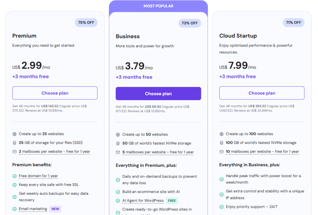 Uno de los mayores atractivos de Hostinger son sus precios. Aunque varían según la región y las promociones, sus planes básicos suelen iniciar desde menos de 2 dólares al mes.